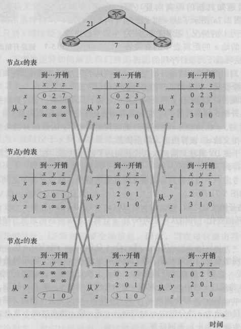 - 某个节点接收到邻居的信息或发现与自己连接的链路开销有变的时候,根据BF方程更新自己的距离向量