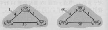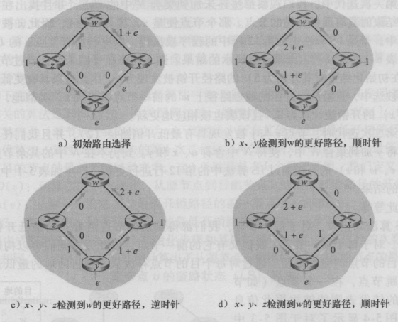 如图的链路为了避免选择高拥塞的道路,每次LS之后都会改变道路,导致了路由实际上处在振荡之中,并且从结果上来看,其选择的也并不是全局最优解