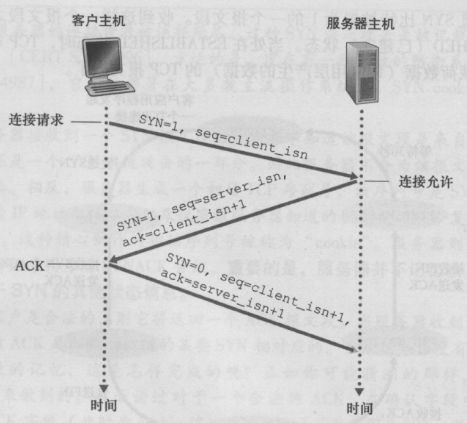 - 服务器接收,分配缓存与变量,选择初始序号,返回SYNACK报文段表示允许连接