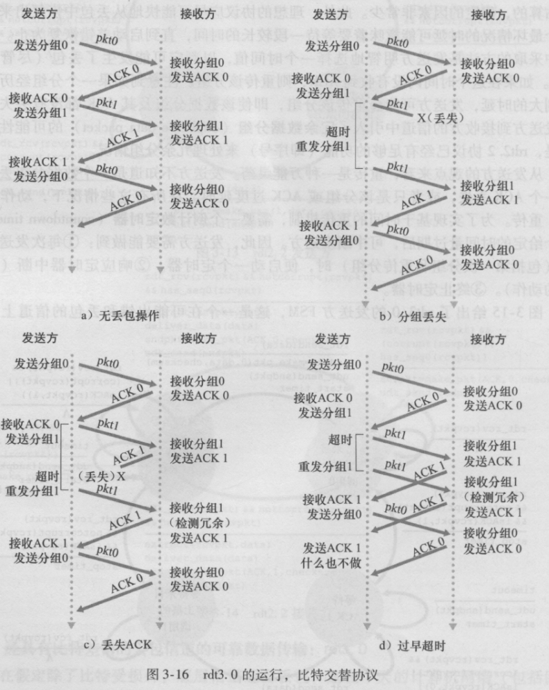 为了处理丢包,在发送发建立一个定时器,使得其能够在一定时间未接收到ACK之后默认为丢包,重发分组并且重置定时器