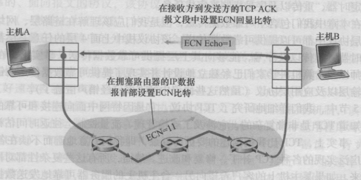 IP协议的首部中有两个比特被用于标记ECN,当接收方收到ECN时则在回复的ACK中设置ECE,发送发收到之后进行窗口减半处理(和超时丢包相同),并在下一个报文段首部标记CWR字段(拥塞窗口缩减)