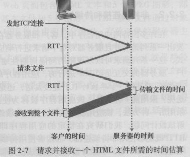 上图中设计三次握手过程,其中前两个过程消耗了一个RTT,最后一次握手以及发送HTML文件这个响应操作消耗了一个RTT,因此总响应时间为传输文件时间